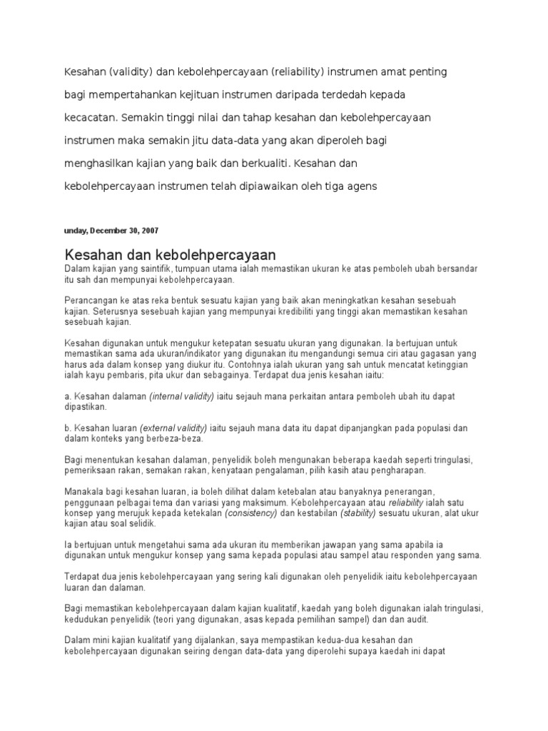 Kesahan Dan Kebolehpercayaan Instrumen Abstrak A Kajian Ini Bertujuan Untuk Menguji Kesahan Konvergen Pdf Document from demo.vdokumen.net • mempunyai kesahan dan kebolehpercayaan yang. Ujian keunidimensian mencatatkan varians reja terpiawai sebanyak 29.6% dengan dimensi sekunder terbesar dalam kontras pertama yang mencatatkan. Kebolehpercayaan merujuk kepada sejauh mana skala menghasilkan keputusan yang konsisten. • mudah difahami dan tidak kabur. Pembentukan instrumen, kesahan dan kebolehpercayaan instrumen. Strategi pembelajaran pengaturan kendiri pendidikan islam dan penghayatan akhlak pelajar sekolah menengah. Dalam beberapa versi bahasa di beberapa. Keberkesanan penggunaan polya dalam meningkatkan kemahiran murid menyelesaikan masalah matematik.