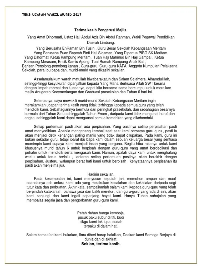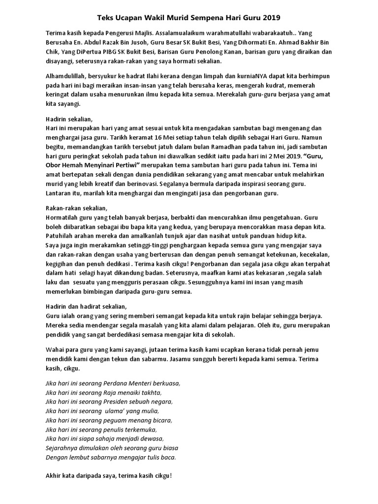 Teks ucapan wakil murid sempena hari guru. We did not find results for: Check spelling or type a new query. Maybe you would like to learn more about one of these?